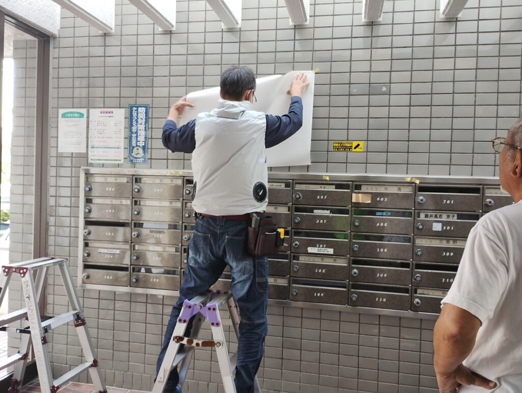 まず、事前に作っておいた掲示板取付用の型紙を貼り、取付位置を決めます。今回は、マンション自治会用と町内会用にそれぞれ1台づつ設置します。