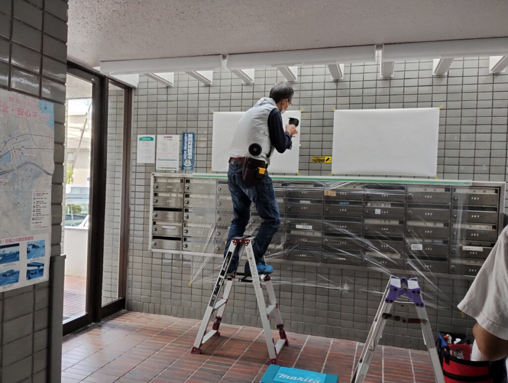 今日のご紹介は、福岡市区西区周船寺の分譲マンション「ホワイトピア周船寺」様です。今回のご依頼内容は、下の写真のようにお知らせや告知のポスター等が煩雑に貼られているとのことで、新たに掲示板の設置をお願いされました。