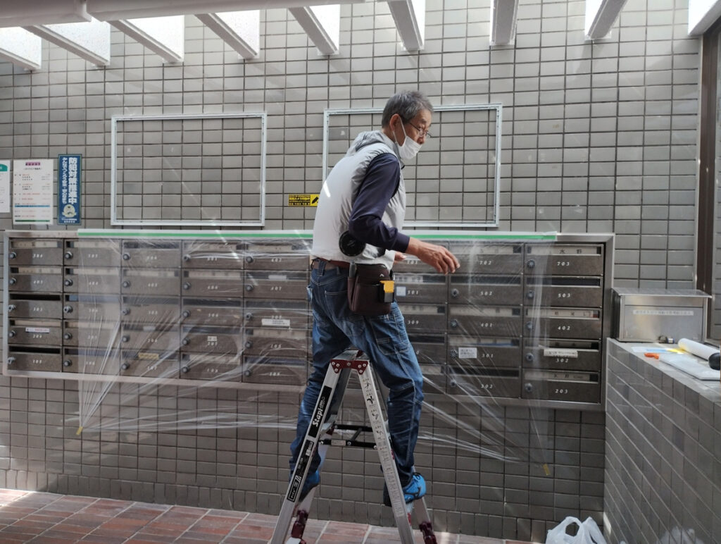 まず、事前に作っておいた掲示板取付用の型紙を貼り、取付位置を決めます。今回は、マンション自治会用と町内会用にそれぞれ1台づつ設置します。