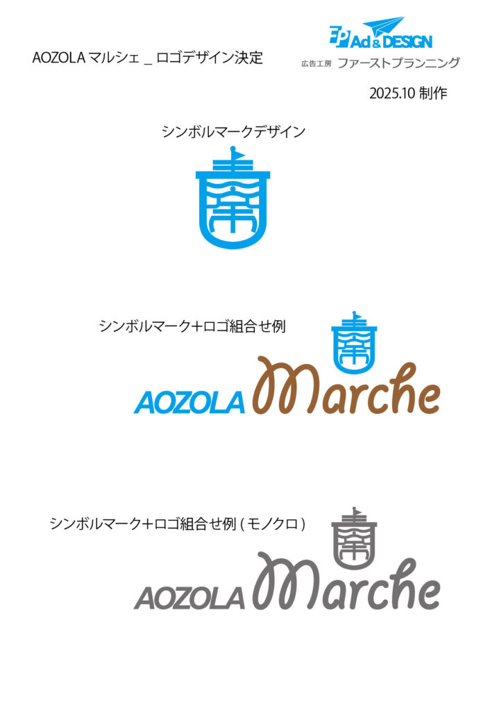 今日のご紹介は、福岡市西区小田部のシェア店舗「AOZOLAマルシェ」様です。今回のご依頼内容は、店名のロゴデザインとロゴを使ったガラス面サインの製作・施工をお願いされました。まずは、ロゴのデザインですがコンセプト毎に数種類のデザイン案を制作いたしました。