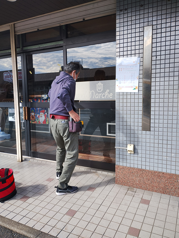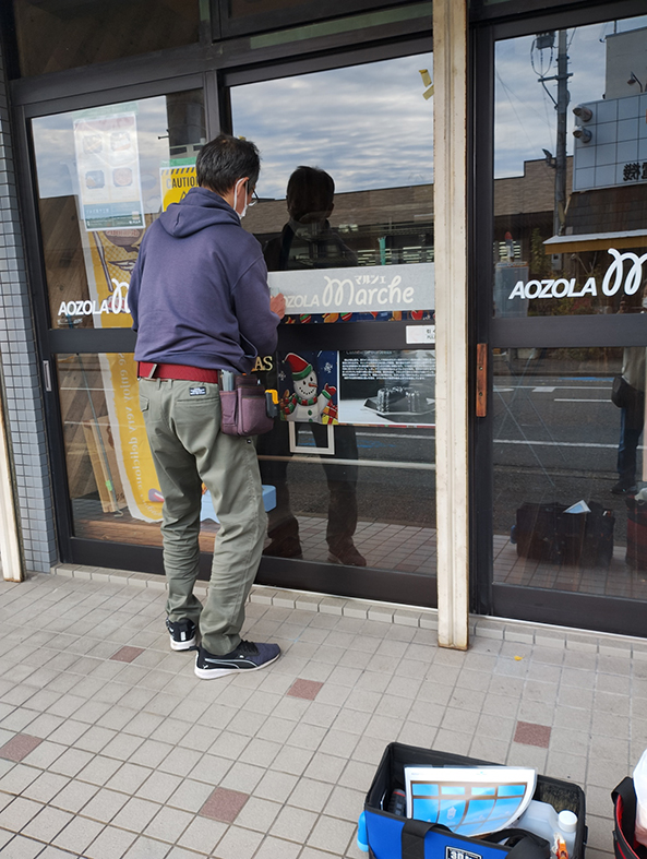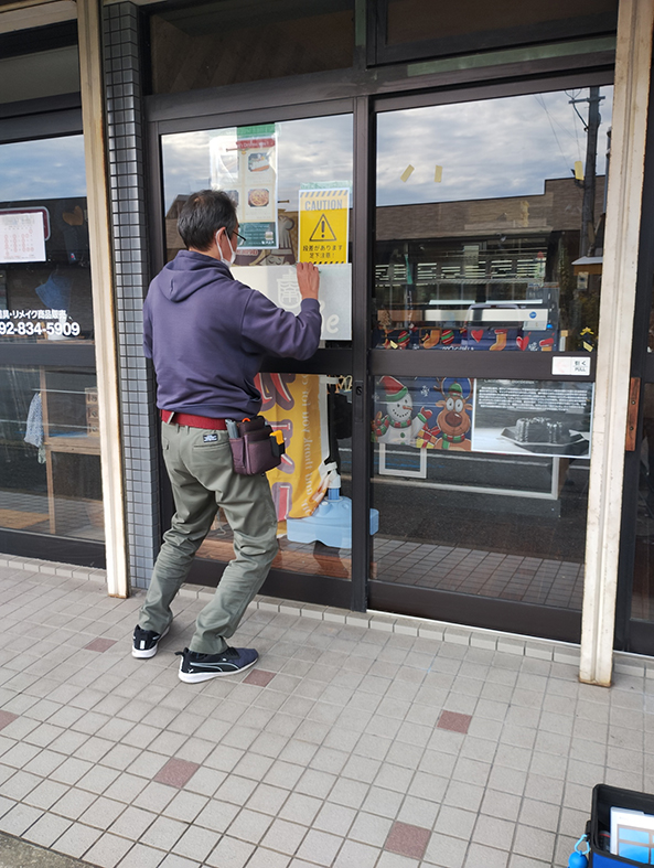 4ヶ所のガラス面にサインを設置しますので、右側から施工をスタートしました。
