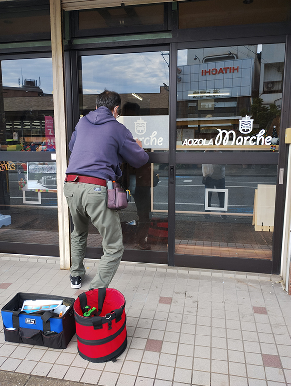 最後に入口のガラス面に大きめのシンボルマーク貼ったらもうすぐ完成です。